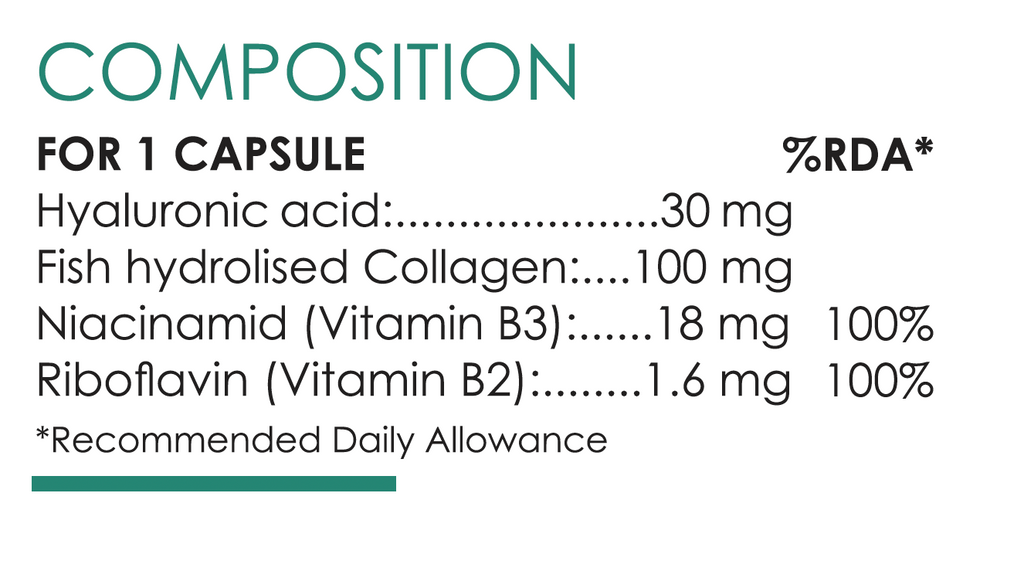 全成分:魚膠原蛋白水解物(含軟體動物及甲殼類)、植物膠囊(羥丙基甲基纖維素)、麥芽糊精、椰子粉、透明質酸、菸鹼醯胺(維他命B3)、核黃素(維他命B2)。