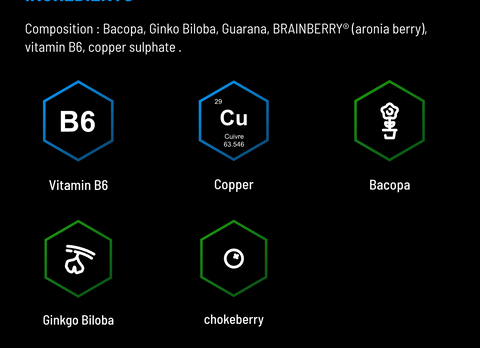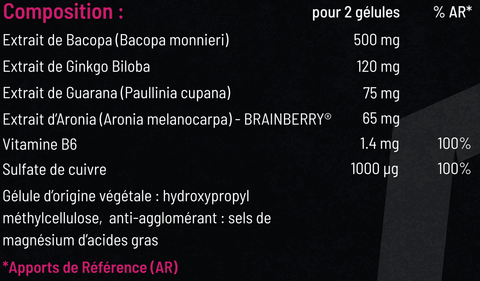 Bacopa 萃取物 (Bacopa monnieri)、植物源性膠囊:羥丙基甲基纖維素、銀杏萃取物、瓜拉納萃取物 (Paullinia cupana)、Aronia 萃取物 (Aronia melanocarpa)、抗結劑:脂肪酸鎂鹽、硫酸銅、維他命 B6。