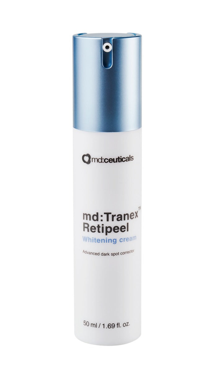 md:ceuticals全新截黑祛斑美白面霜md:TranexTM Retipeel Whitening Cream,以Tranexamic Acid傳明酸、Hexylresorcinol己基間苯二酚及 Alpha Arbutin熊果素研製出革命性3重袪斑美白複方,有效阻斷黑色素 形成路徑,抑制酪氨酸酶的活性,全面狙擊深層色斑(如荷爾蒙斑、 老年斑及血管形成的色素沉著等),淡化淺層色斑(如太陽斑及 暗瘡印等),改善膚色不均,明亮膚色,為醫學護膚帶來嶄新突破。