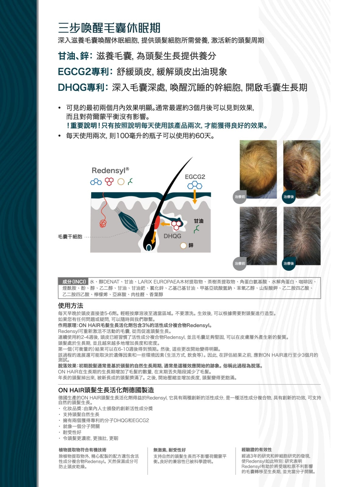 On Hair 含3%有效生髮成份Redensyl:創新活性成分而In-Cosmetics Global Group 2014年In-Cosmetics銀獎。複合物可支持自然的頭髮生長,並且防止脫髮。此成份可刺激血液循環,並為毛囊提供重要的營養和維生素。支持頭髮的自然生長,並抵消遺傳性脫髮!可刺激不活動的毛囊,促進頭髮生長。另外加入甘油、鋅,讓毛囊得到滋養,為頭髮生長提供養分。