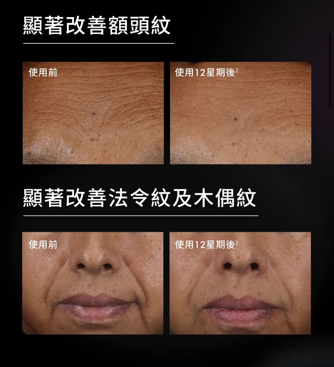 12星期的臨床測試證實,有效改善面部細紋及鬆弛問題: